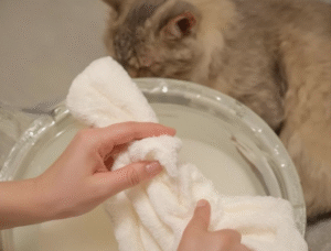 Wear gloves if you wish. Use a soft cloth dampened with warm water to gently wipe your pet’s face, body, and any soiled areas.