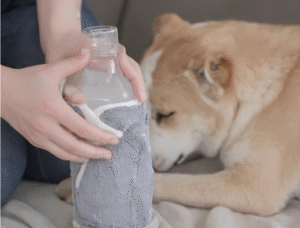 Position Correctly: In the coolest part of your home, lay down a plastic bag (for protection) covered with an old towel. Place your pet on the towel. Wrap the frozen bottles in towels and place them against your pet’s abdomen and back.
